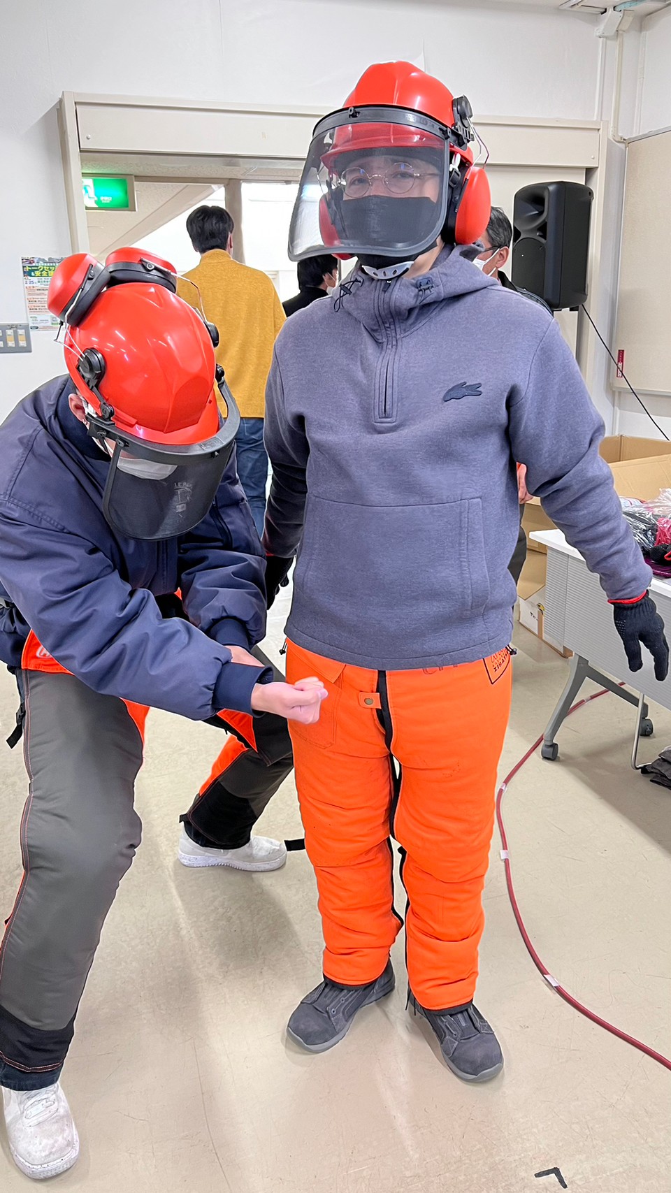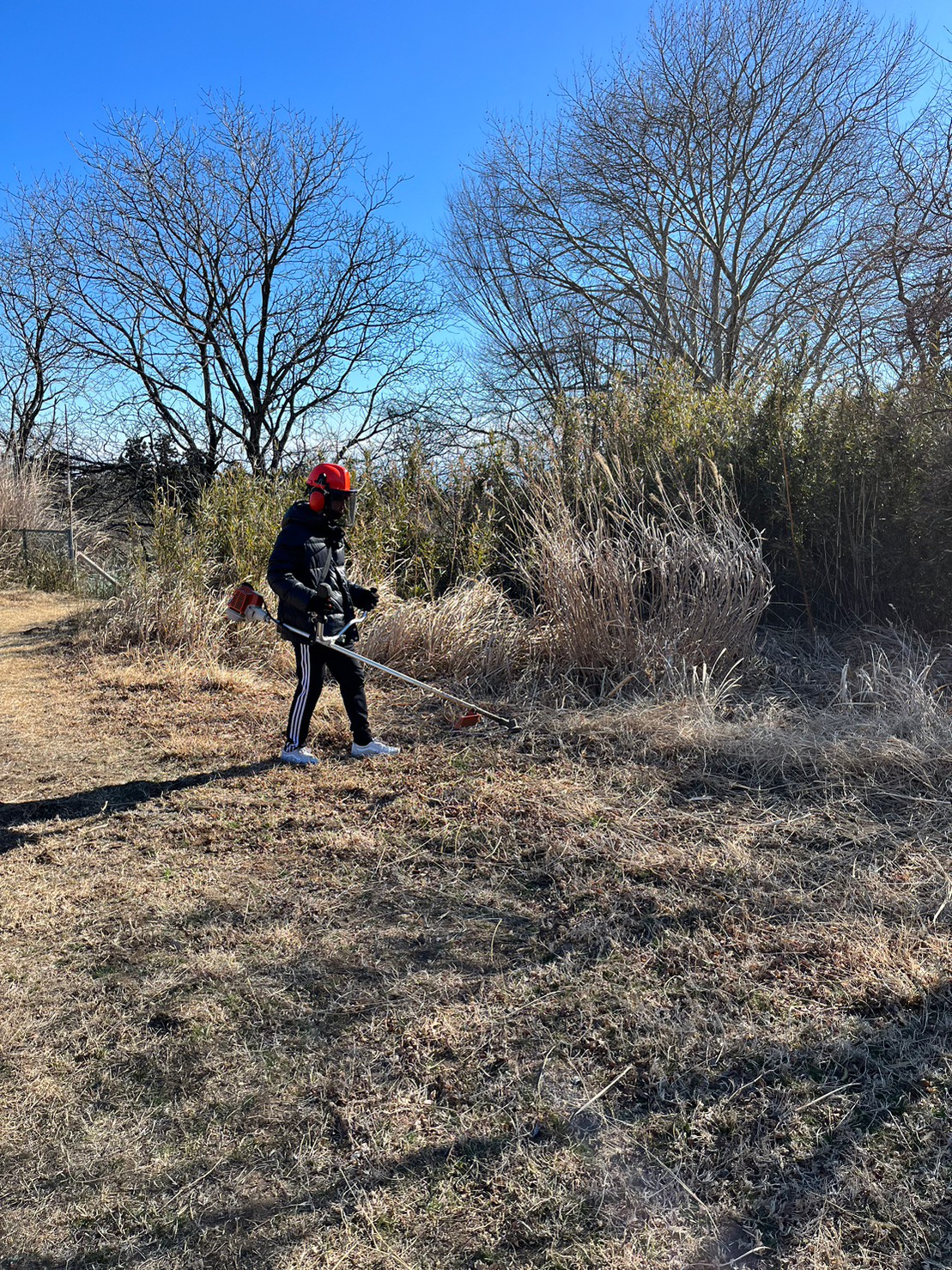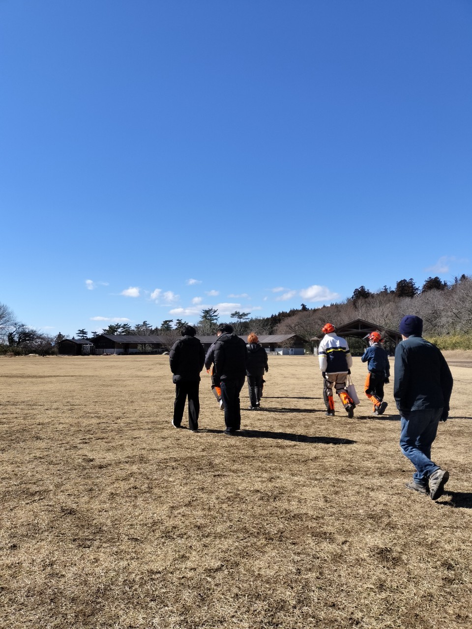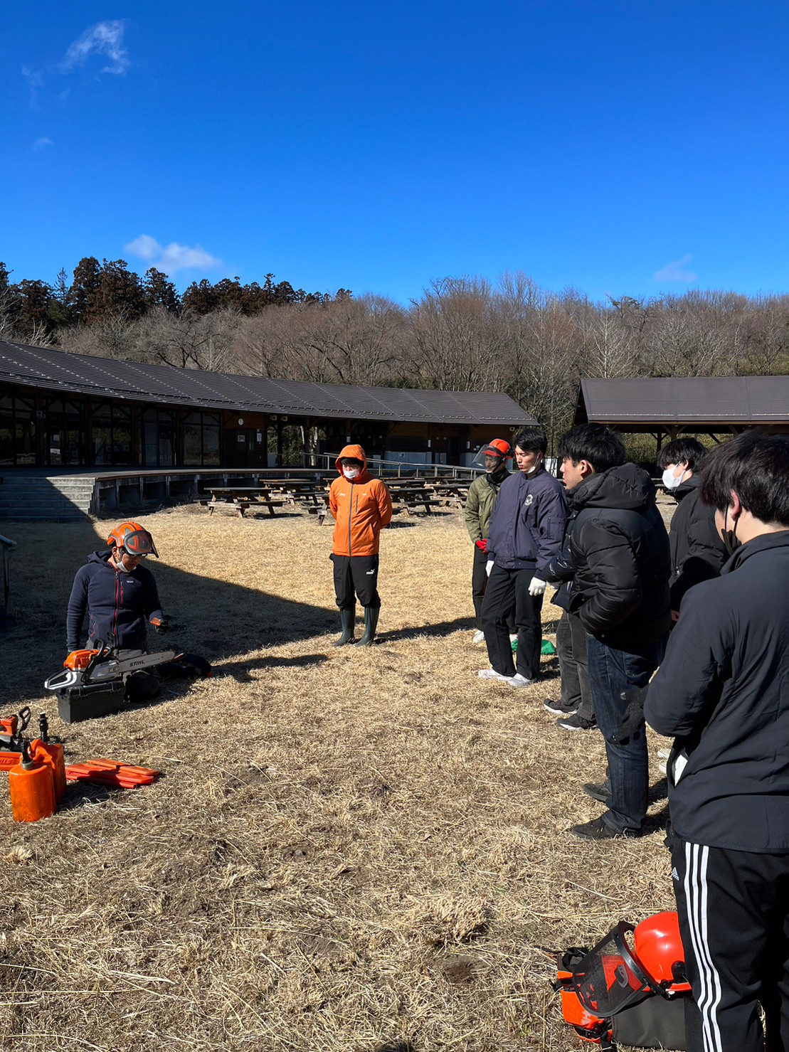 林みたいなとこでやるのかな?と思っていたが、多目的フィールドは想像以上に広く、木々がないグラウンドだった。I see, I see, グラウンドの端に丸太🪵があり、それを切るようだ。そして何より風が強すぎた。そこら辺の台風より明らかに風が強かったように感じる。強風で寒さ倍増セールの中、チェーンソーと草刈り機の使い方や注意点をしっかり学び、手本を見せて頂いた。