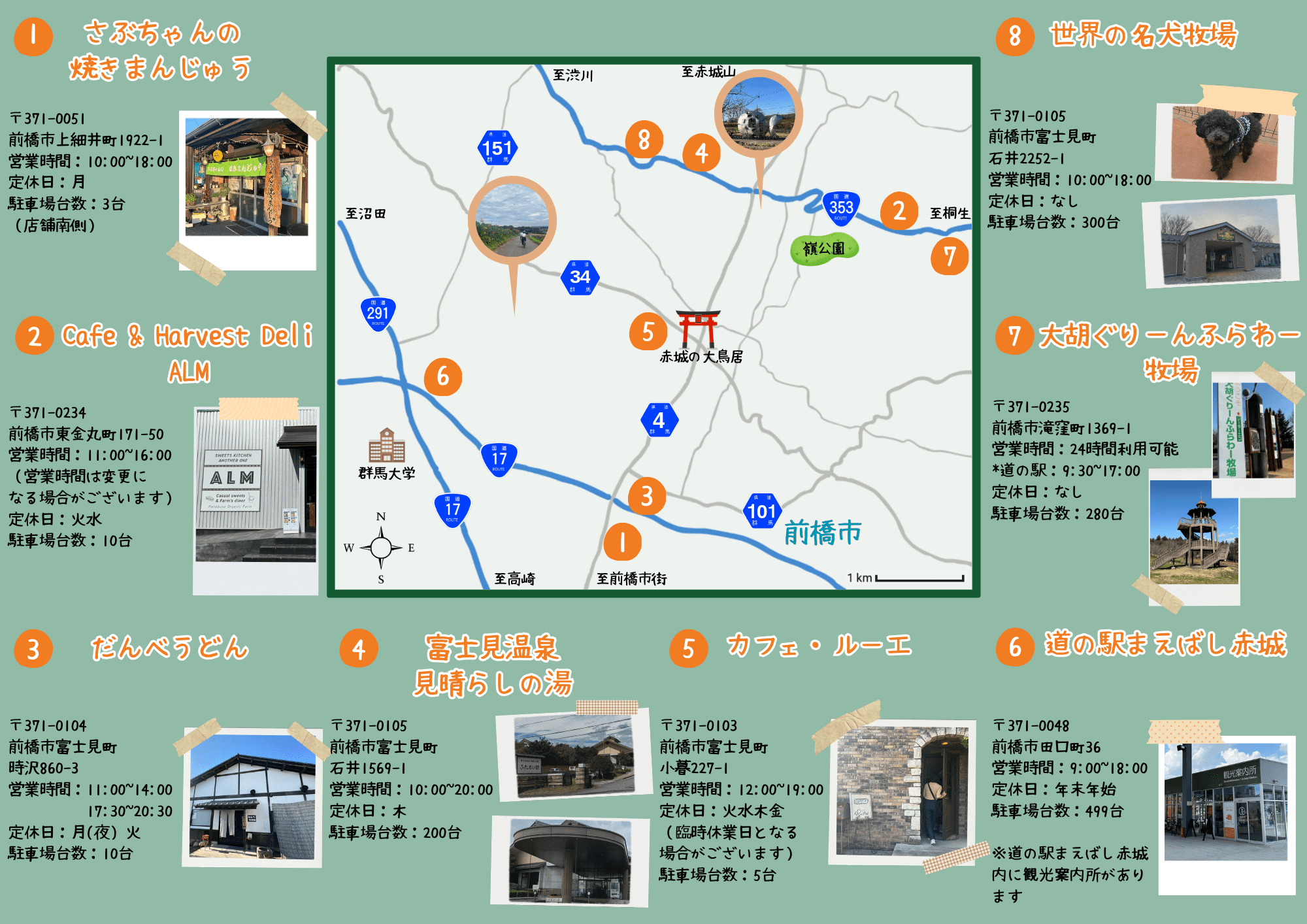 東洋大学国際学部国際学部学科鈴木ゼミ2期生マップ制作チームが東京の大学生目線で発見した前橋・赤城スローシティエリアの”スローなポイント”を詰め込んだ今までになかった観光マップです。